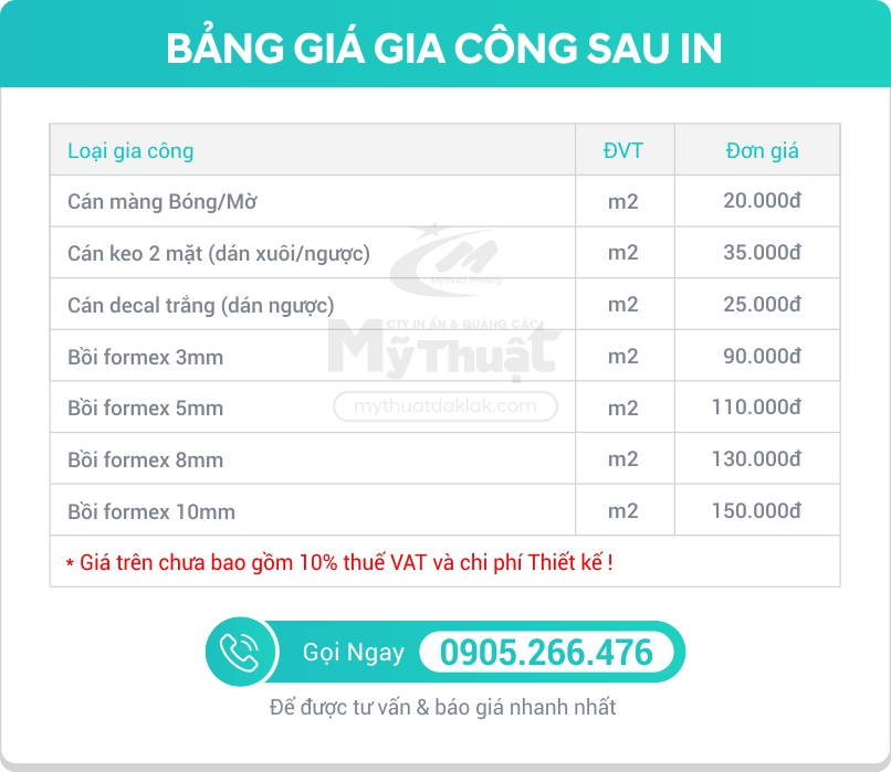 BẢNG GIÁ GIA CÔNG SAU IN
