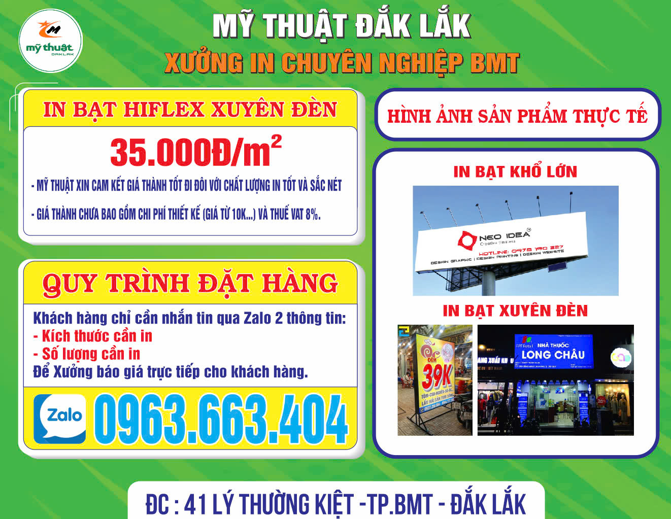 Xưởng in Mỹ Thuật Daklak Chuyên: In Bạt Khổ Lớn, In Ấn Quảng Cáo, In Phông Bạt, In Băng Rôn Quảng Cáo, In Biển Quảng Cáo, In Decal Dán, In Decal Giấy, In Decal Nhựa, In Decal Giá Rẻ, In Decal Chất Lượng Cao, In Decal Trong, In Decal Dán Kính, In Decal Lấy Ngay, In Tem Nhãn Decal, In Decal Ô Tô, In Backlit Film, In PP (keo/không Keo), In PP Bồi Formex, In Phông Họp Báo, Họp Lớp, In Phông Hội Thảo, Hội Nghị, In Phông Cưới, In Poster Quảng Cáo, In Standee - In Standy, In Lụa - In Vải Silk, In Uv Cuộn, In Uv Phẳng, Tranh Dán Tường 3d, Thiết Kế In Ấn, Thiết Kế Menu, In Menu Giá Rẻ, Cắt Bế Tem Nhãn, Gia Công Cán Màng, In Giấy A0 - Báo Tường, In Tranh Dạy Học, In Giấy A4 - A3, In Namecard - Danh Thiếp, In Tờ Rơi...Tại Buôn Ma Thuột (BMT), Daklak
