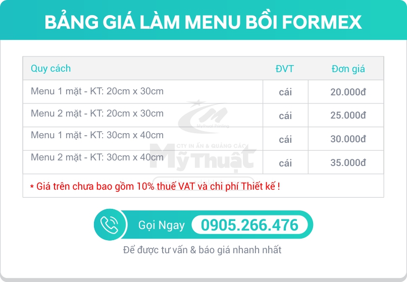Gọi ngay 0963.663.404BẢNG GIÁ LÀM MENU BỒI FORMEX